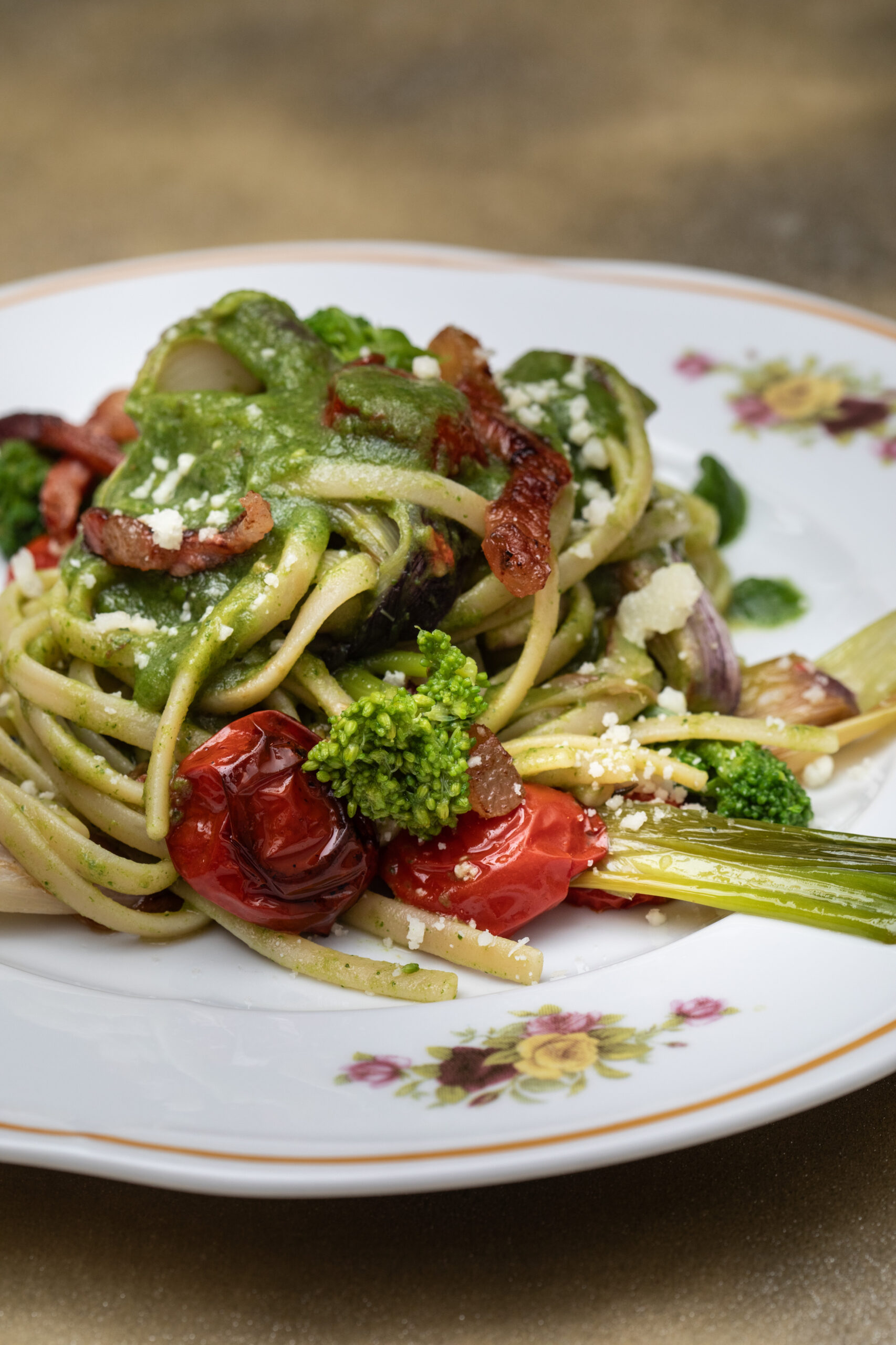 E così, in nome della stagionalità e microstagionalità di inizio autunno, Franco unisce i sapori emiliani di stalle e orti sotto l’egida di una linguina Al Bronzo Barilla, che ben aggancia l’intingolo. Il cipollotto fresco viene cotto intero, i primi broccoletti vengono cotti e i gambi frullati a formare una crema che fa da base al tubero, al guanciale saltato in padella e agli ultimi pomodori della stagione appena scottati. Tutte cotture espresse per un piatto che profuma di orto, delle ultime propaggini di un autunno che si invena nell’estate dell’incontro tra due regioni che per Franco sono un sentimento, Emilia e Abruzzo, coronato con unan spolverata di pecorino, a dare il perfetto equilibro a irresistibili forchettate.