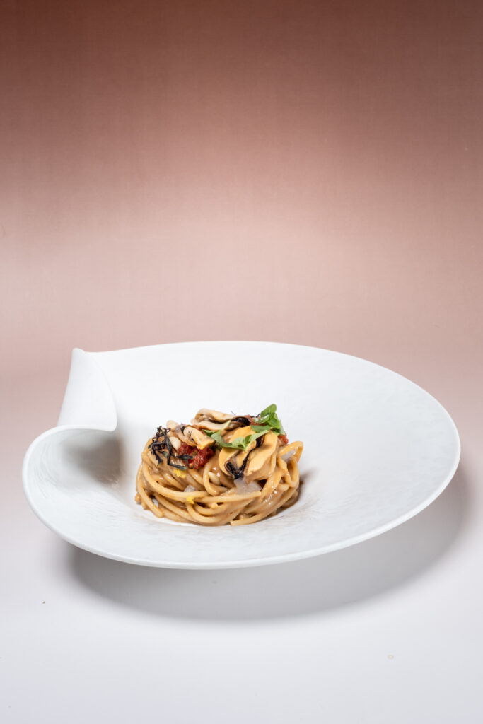 A dare concretezza a questa filosofia, chef Pisano ha creato un piatto per il team Artisti di Al Bronzo Barilla, lo Spaghetto freddo con molluschi e crostacei. La salsa, ottenuta da soffritto di olio, aglio, concassé di pomodoro, cozze e fumetto di pesce frullato, esalta i sapori dei crostacei. La pasta, cotta e raffreddata, viene asciugata come una vera pastasciutta, rifinita con limone salato, gelatina di colatura di cozze marinate, basilico e cozze gigante di Olbia, valorizzando la materia prima sarda e la filosofia dello chef.