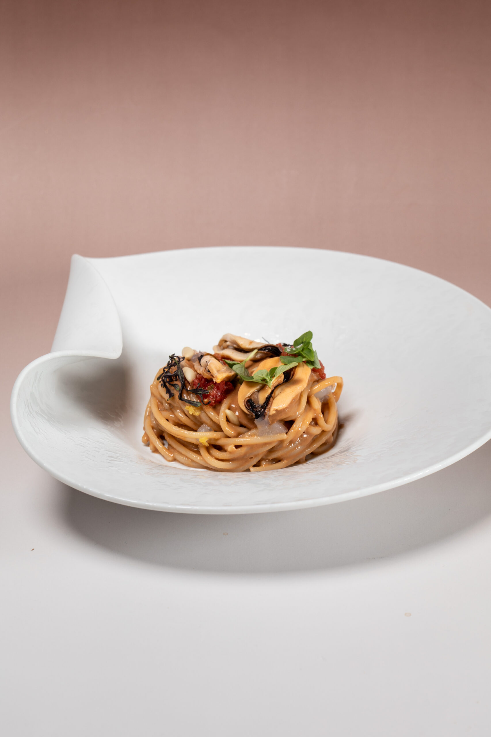 A dare concretezza a questa filosofia, chef Pisano ha creato un piatto per il team Artisti di Al Bronzo Barilla, lo Spaghetto freddo con molluschi e crostacei. La salsa, ottenuta da soffritto di olio, aglio, concassé di pomodoro, cozze e fumetto di pesce frullato, esalta i sapori dei crostacei. La pasta, cotta e raffreddata, viene asciugata come una vera pastasciutta, rifinita con limone salato, gelatina di colatura di cozze marinate, basilico e cozze gigante di Olbia, valorizzando la materia prima sarda e la filosofia dello chef.
