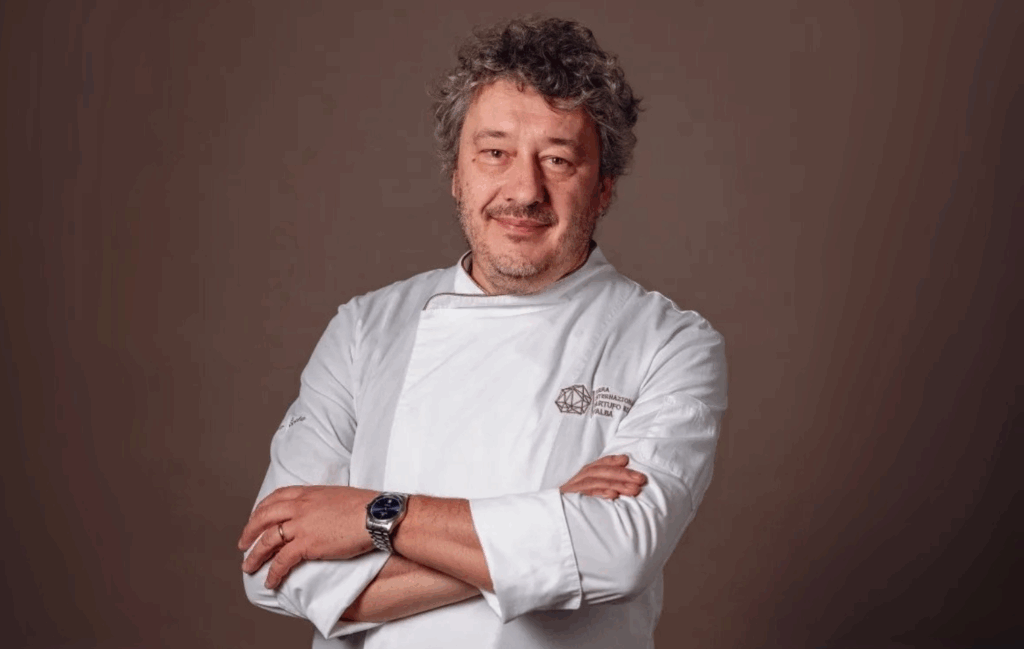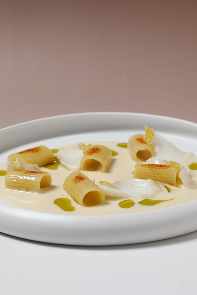 Il Mezzo rigatone creato per il Team Artisti al Bronzo di Barilla, viene condito con una crema di cipolla dolce e il merluzzo che Costa acquista e mette in salagione per conto proprio, a creare un baccalà al contrario, che gli consente però di monitorare le fasi di stagionatura in base alle condizioni climatiche e al risultato di gusto e consistenza che vuole ottenere. Un piatto che nasce a fine estate, con la campagna che si profuma di fichi che vanno ad aromatizzare l’olio con cui viene rifinito il piatto insieme al limone, altra eco ligure, che non è nostalgico ricordo ma memoria vivida e rinfrescante. Un piatto che gioca sulle consistenze della crema e il morso della pasta croccante e dei petali del baccalà, tra dolcezze e sapidità, con il medium delle acidità che lo rendono contemporaneo e raffinato.