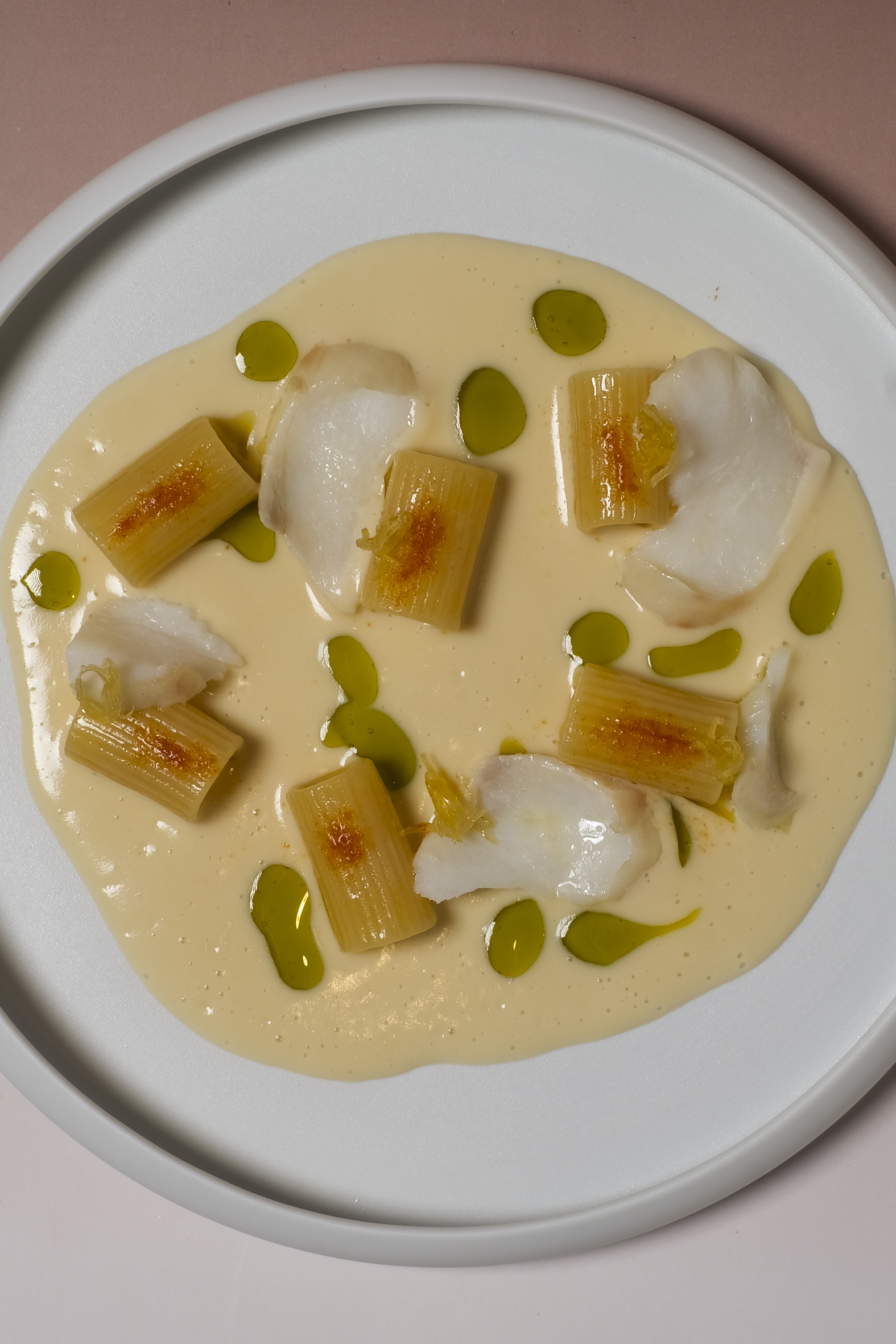 Il Mezzo rigatone creato per il Team Artisti al Bronzo di Barilla, viene condito con una crema di cipolla dolce e il merluzzo che Costa acquista e mette in salagione per conto proprio, a creare un baccalà al contrario, che gli consente però di monitorare le fasi di stagionatura in base alle condizioni climatiche e al risultato di gusto e consistenza che vuole ottenere. Un piatto che nasce a fine estate, con la campagna che si profuma di fichi che vanno ad aromatizzare l’olio con cui viene rifinito il piatto insieme al limone, altra eco ligure, che non è nostalgico ricordo ma memoria vivida e rinfrescante. Un piatto che gioca sulle consistenze della crema e il morso della pasta croccante e dei petali del baccalà, tra dolcezze e sapidità, con il medium delle acidità che lo rendono contemporaneo e raffinato.
