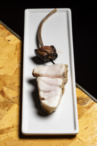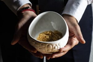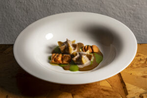 Francesco cucina il mare e la laguna in ognuna delle loro essenze: profumi e sentori; iodio e sale; salmastro e citrico; teste e occhi di pesce; erbe di mare, erbe di terra e alghe; lische, bottarga, fondi, salumi di mare.