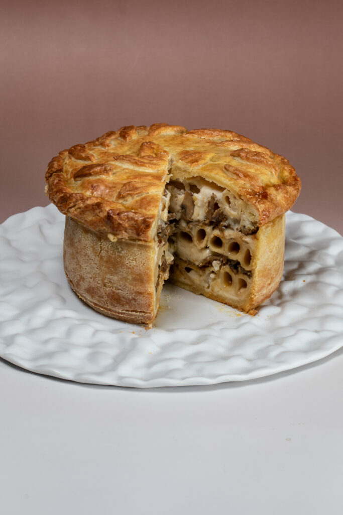 Il pasticcio ferrarese è una sontuosa torta salata racchiusa in un involucro di pasta dolce o brisée, spesso addolcita con zucchero o profumata con spezie, che nella ricetta di Erbluigia custodisce all’interno un ricco ripieno di maccheroni conditi con ragù di colombaccio, le sue interiora, funghi misti saltati (champignon e trombette di morto), tartufo nero quando disponibile, besciamella e parmigiano e tanta noce moscata.
