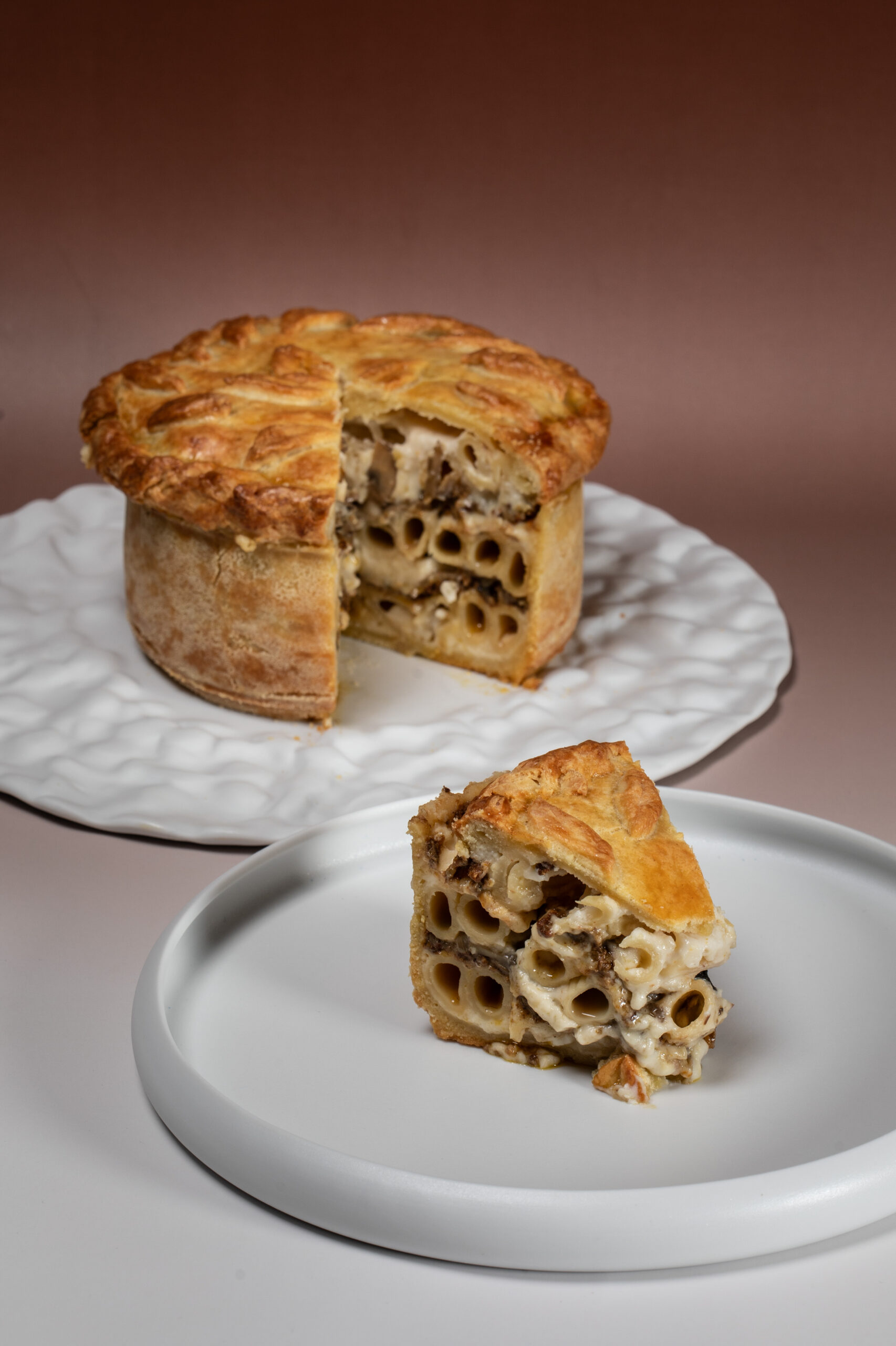 Il pasticcio ferrarese è una sontuosa torta salata racchiusa in un involucro di pasta dolce o brisée, spesso addolcita con zucchero o profumata con spezie, che nella ricetta di Erbluigia custodisce all’interno un ricco ripieno di maccheroni conditi con ragù di colombaccio, le sue interiora, funghi misti saltati (champignon e trombette di morto), tartufo nero quando disponibile, besciamella e parmigiano e tanta noce moscata.