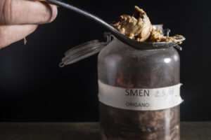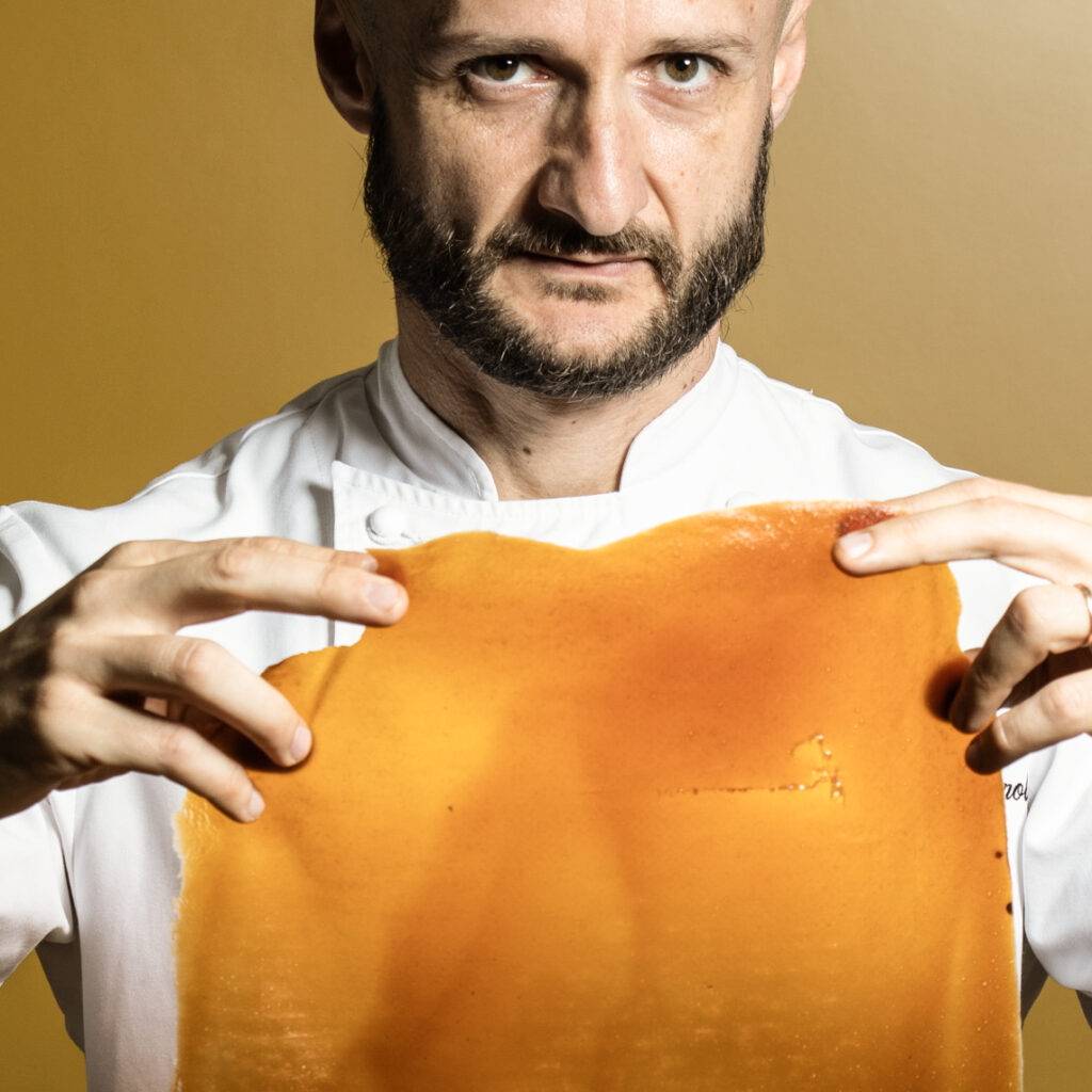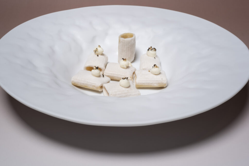 Emblematico il piatto Mezze Maniche Al Bronzo Barilla, muffa, cacio e pepe: pasta secca reidratata, fermentata, inoculata con aspergillus — lo stesso che genera sakè, miso e salsa di soia — e con penicillium camemberti, la muffa bianca dei Camembert e Brie. Una trasformazione di 36-48 ore che conduce a una pasta servita fredda, accompagnata da una crema di cacio e pepe: consistenza tenace e vellutata, diversa dal classico al dente, e un profilo aromatico sorprendente, fatto di note floreali e toni “muffati” che ampliano la profondità gustativa.