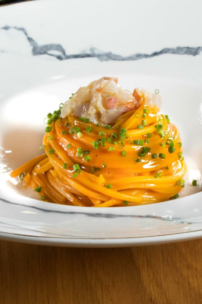 Lo racconta bene Profondità, il menu che esplora il mare a partire dalla riva, tra alghe, piante aromatiche e materie prime che definiscono l’identità di Impronta d’Acqua. Nella stessa direzione si inserisce il lavoro sullo scarto zero, ben rappresentato dallo Spaghetto al Bronzo Barilla: la pasta viene cotta in un brodo ricavato dagli scarti di seppia di un piatto appartenente allo stesso percorso di degustazione, quindi condita con triglia cruda, una spremuta di triglia piccante ed erba cipollina. Il risultato è un morso deciso, che amplifica le note iodate e introduce un’ulteriore stratificazione gustativa.