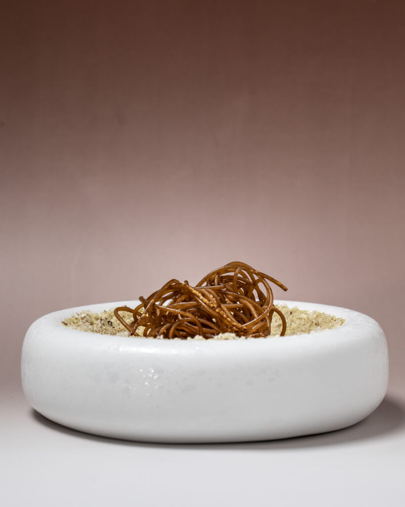 In omaggio all’italianità, il carboidrato resta protagonista. Anche la pasta viene coinvolta nel processo, assumendo consistenze e profili aromatici inediti. Così nasce lo Spaghetto Al Bronzo Barilla marinato in fondo di capriolo, un piatto manifesto che ribalta le regole della cottura.