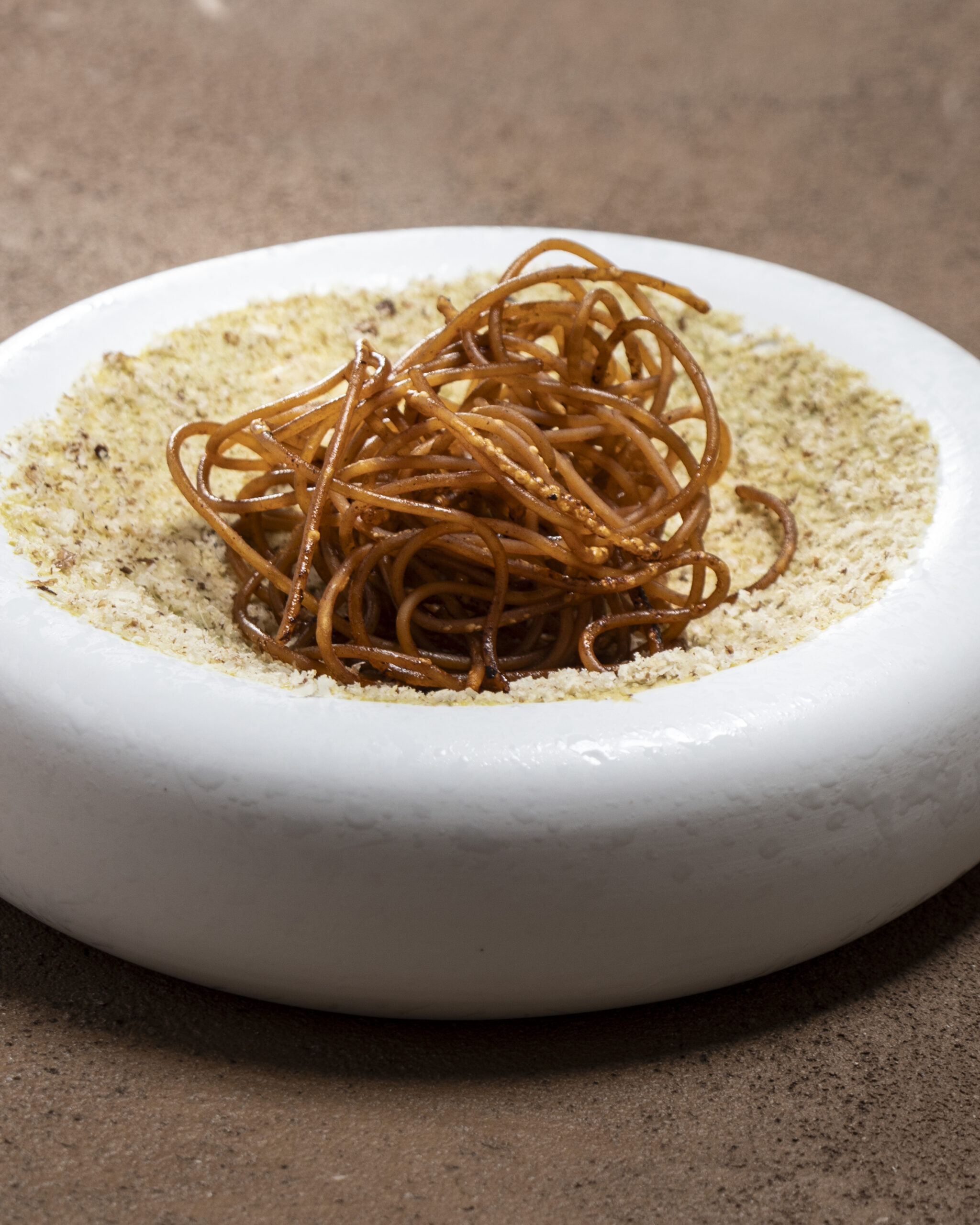 In omaggio all’italianità, il carboidrato resta protagonista. Anche la pasta viene coinvolta nel processo, assumendo consistenze e profili aromatici inediti. Così nasce lo Spaghetto Al Bronzo Barilla marinato in fondo di capriolo, un piatto manifesto che ribalta le regole della cottura.