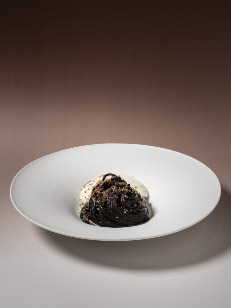 Così l’aglione della Val di Chiana, fermentato fino a 50 giorni, assume il caratteristico colore nero. Ridotto in crema ed emulsionato con brodo di pollo, diventa condimento degli Spaghetti al Bronzo Barilla: la loro trafilatura porosa cattura il sapore e crea una sinfonia di consistenze, affiancata da una spuma di burrata e rafano, che con le note lattiche e piccanti contrasta aromi e temperature del piatto.