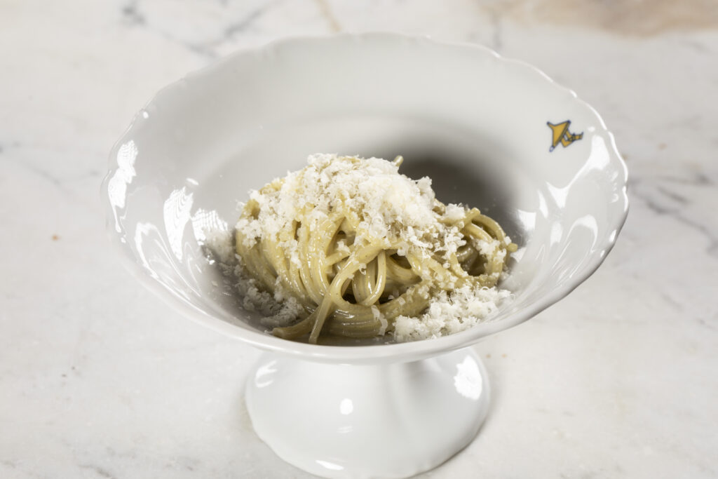 Con lo Spaghetto Al Bronzo Barilla, lo chef ha riportato in auge un piatto ideato oltre dieci anni fa, dedicato a una delle sue erbe selvatiche più identitarie: l’elicriso, che cresce sulle dune della Versilia. Il suo profumo balsamico e resinoso incarna l’immaginario della macchia mediterranea e diventa elemento narrativo centrale: un aroma netto, incisivo, capace di definire l’intero piatto.