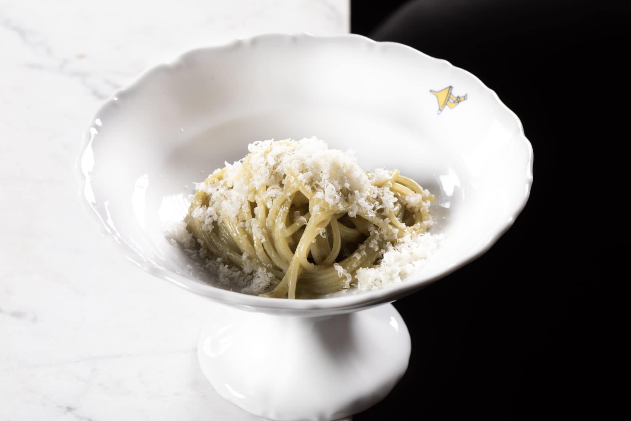 Con lo Spaghetto Al Bronzo Barilla, lo chef ha riportato in auge un piatto ideato oltre dieci anni fa, dedicato a una delle sue erbe selvatiche più identitarie: l’elicriso, che cresce sulle dune della Versilia. Il suo profumo balsamico e resinoso incarna l’immaginario della macchia mediterranea e diventa elemento narrativo centrale: un aroma netto, incisivo, capace di definire l’intero piatto.