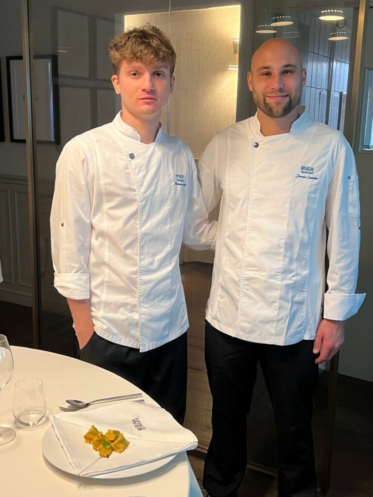 Per il progetto Artisti di Al Bronzo ideato da Barilla, i due chef passano in rivista un piatto storico di Ma.Ri.Na, una pasta al nero di seppia con calamaretti. “Emozioni in bianco e nero” è la rilettura di questo piatto, come si sfoglia un vecchio album di foto che è ancora capace di emozionare e di rinnovarsi. Così della seppia si usano tutte le parti, oltre al liquido, nel suo brodo viene finita di cuocere la pasta, la seppia viene cotta sottovuoto e disposta nell’impiattamento in striscioline. Lo zero spreco è uno dei cardini della nouvelle vague del ristorante, in linea con i valori propugnati oggi dalla migliore ristorazione, mentre l’aggiunta del pomodoro cotto su brace vuole rafforzare il sapore con note mediterranee, insieme all’alga di mare e muschio stellato, a far vibrare il gusto sulle onde salmastre.