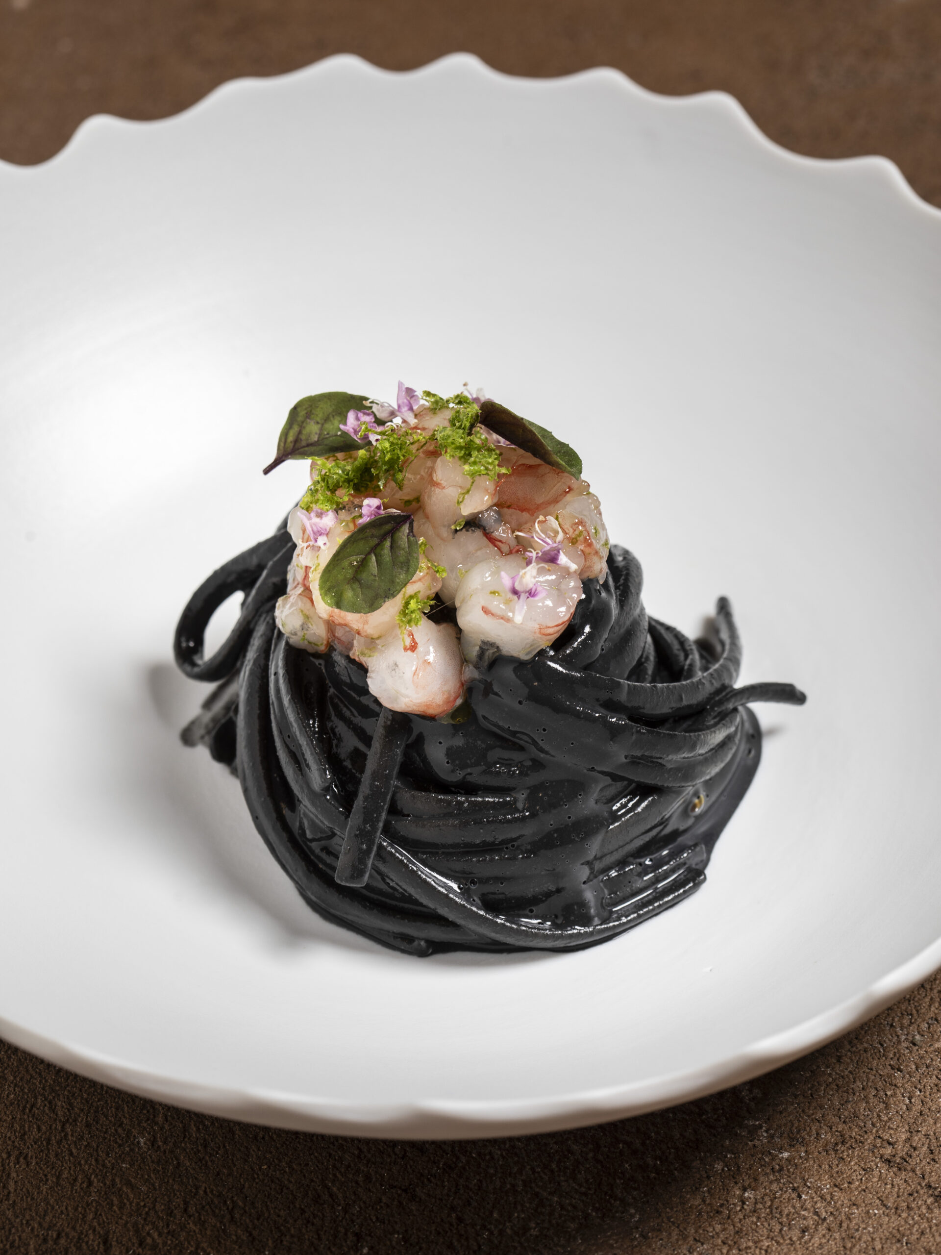 Per il progetto Artisti di Al Bronzo ideato da Barilla, i due chef passano in rivista un piatto storico di Ma.Ri.Na, una pasta al nero di seppia con calamaretti. “Emozioni in bianco e nero” è la rilettura di questo piatto, come si sfoglia un vecchio album di foto che è ancora capace di emozionare e di rinnovarsi. Così della seppia si usano tutte le parti, oltre al liquido, nel suo brodo viene finita di cuocere la pasta, la seppia viene cotta sottovuoto e disposta nell’impiattamento in striscioline. Lo zero spreco è uno dei cardini della nouvelle vague del ristorante, in linea con i valori propugnati oggi dalla migliore ristorazione, mentre l’aggiunta del pomodoro cotto su brace vuole rafforzare il sapore con note mediterranee, insieme all’alga di mare e muschio stellato, a far vibrare il gusto sulle onde salmastre.