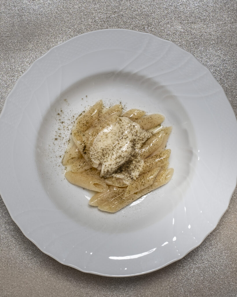 Oggi quel ricordo prende forma in una versione adulta e consapevole. Le mezze penne vengono avvolte da una preparazione a base di burro, rosmarino, parmigiano e limone, lavorata in spuma e sifonata direttamente sulla pasta. Il piatto si consuma al cucchiaio, scelta che enfatizza la dimensione sensoriale e permette di cogliere con precisione le diverse sfumature gustative, freschezza agrumata, nota amaricante del rosmarino, dolcezza del burro, profondità umami del formaggio e del carboidrato.