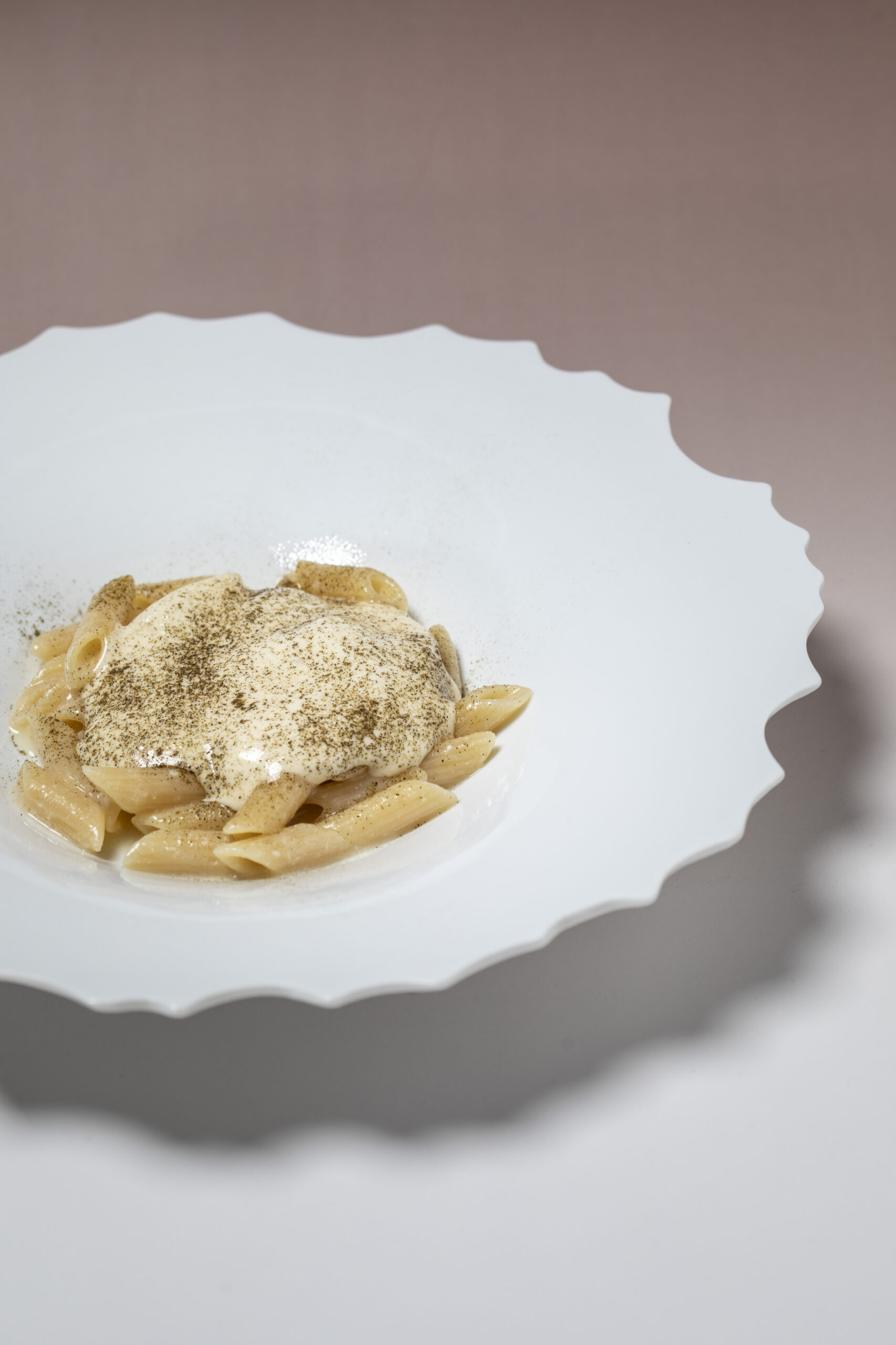 Oggi quel ricordo prende forma in una versione adulta e consapevole. Le mezze penne vengono avvolte da una preparazione a base di burro, rosmarino, parmigiano e limone, lavorata in spuma e sifonata direttamente sulla pasta. Il piatto si consuma al cucchiaio, scelta che enfatizza la dimensione sensoriale e permette di cogliere con precisione le diverse sfumature gustative, freschezza agrumata, nota amaricante del rosmarino, dolcezza del burro, profondità umami del formaggio e del carboidrato.