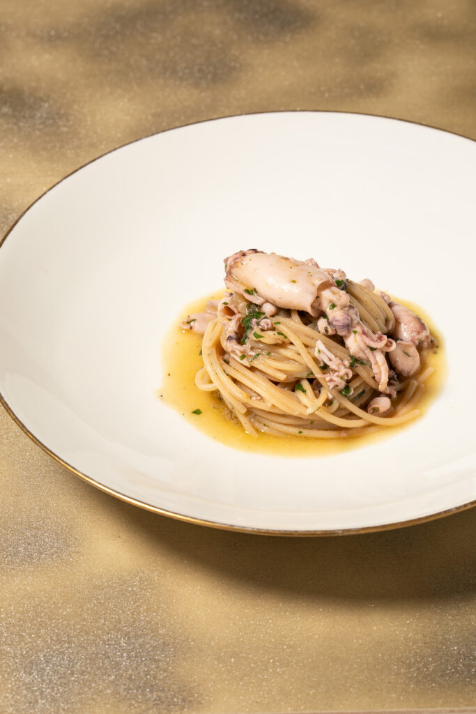 Tra i primi piatti più interessanti dell’autunno spiccano le Linguine al Bronzo Barilla con calamaretti spillo e acqua di pomodoro del piennolo, che raccontano la microstagionalità di questi delicati cefalopodi e il ricordo della ricetta partenopea del moscardino alla luciana. Un piatto di grande materia prima, dove il morso della pasta secca, risottata in acqua di pomodoro, si tinge di una sottile acidità che bilancia la dolcezza iodata del calamaretto appena scottato in padella. Fondente e abbondante, regala una delle migliori espressioni del nostro mare — da gustare comodamente seduti di fronte al suo orizzonte blu.