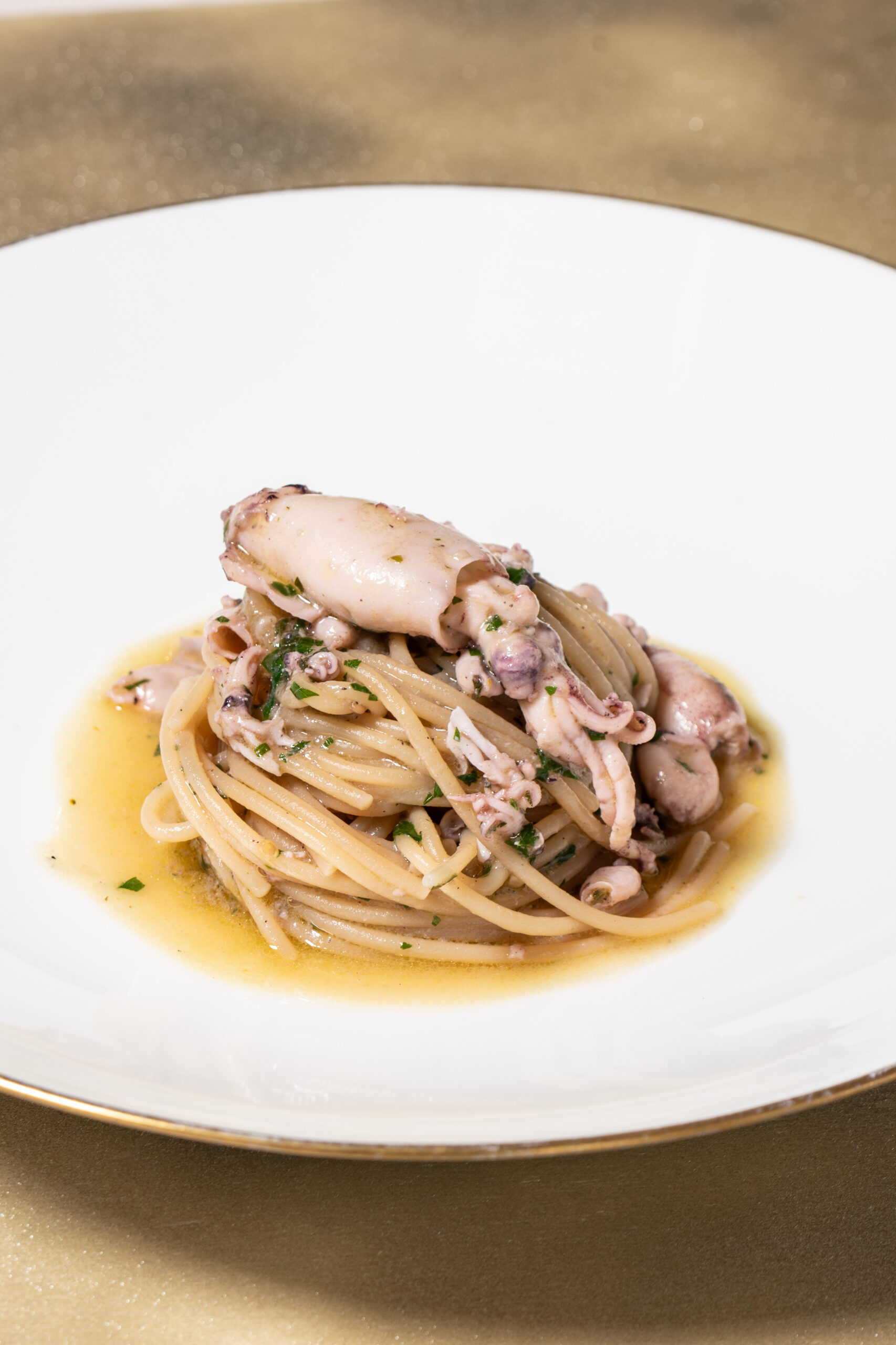 Tra i primi piatti più interessanti dell’autunno spiccano le Linguine al Bronzo Barilla con calamaretti spillo e acqua di pomodoro del piennolo, che raccontano la microstagionalità di questi delicati cefalopodi e il ricordo della ricetta partenopea del moscardino alla luciana. Un piatto di grande materia prima, dove il morso della pasta secca, risottata in acqua di pomodoro, si tinge di una sottile acidità che bilancia la dolcezza iodata del calamaretto appena scottato in padella. Fondente e abbondante, regala una delle migliori espressioni del nostro mare — da gustare comodamente seduti di fronte al suo orizzonte blu.